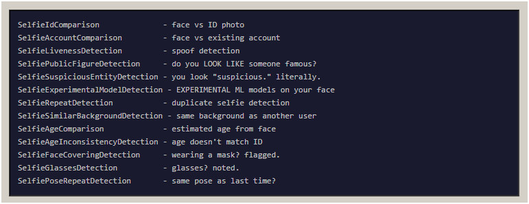 Mas, nos bastidores, o código tinha funções com nomes que fariam qualquer um coçar a cabeça: SelfieSuspiciousEntityDetection. O que isso faz? Compara sua foto não só com seu documento, mas com bancos de dados de listas de vigilância, pessoas politicamente expostas e… bem, praticamente tudo que poderia ser classificado como “suspeito”.